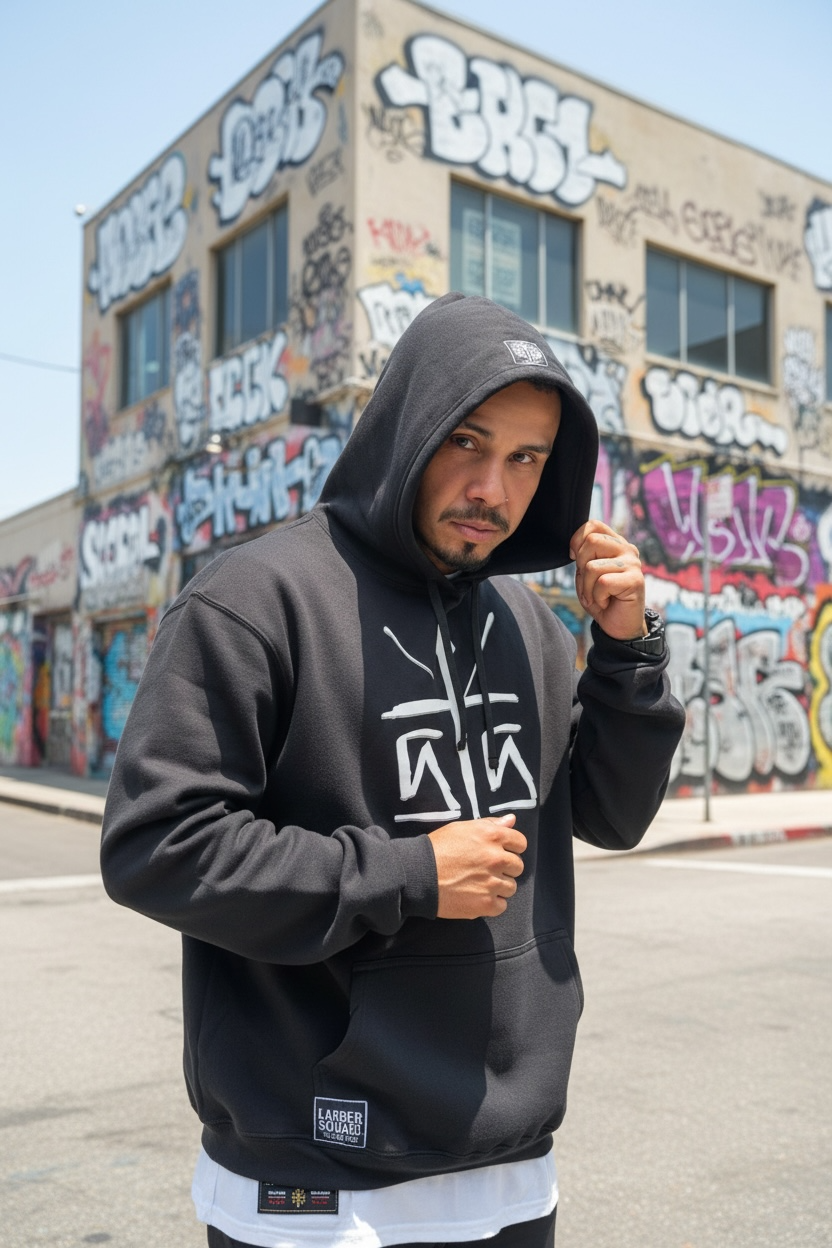 Sudadera 50/50 en color negro con gorro, cierre y bolsas frontales.